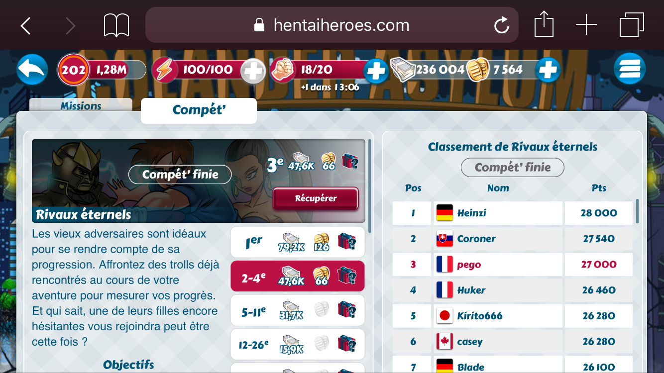 pego Posted April 11, 2018 Author Share Posted April 11, 2018 Arf dommage, c’est un peu incohérent de le faire pendant le sommeil des joueurs car ça favorise un certain hémisphère geographique ou une classe de joueur qui se lève dans cette tranche horaire il y a je pense un peu de frustration pour les joueurs que nous sommes car il n’y a pas la combativité d’etre 1er....il faut dépenser son énergie ou son argent a 04h45 pour avoir la chance d’etre dans le top dans la plupart des cas -> dans les 5 dernières heures de la compétition , c’est là où tout se joue et malgré cela, beaucoup de la communauté son au lit je fais souvent des top 5 pour ma part car on me mange l’herbe sous le pied au dernier moment .... dommage Link to comment Share on other sites More sharing options...