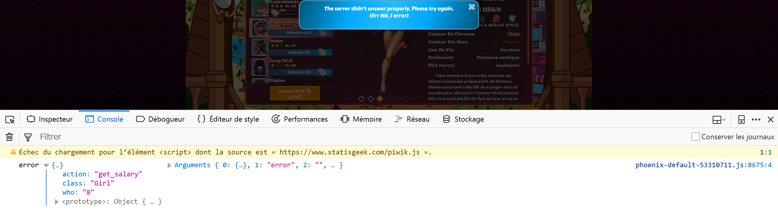 terreur32 Posted August 7, 2018 Share Posted August 7, 2018 truc bizarre je viens de rafraîchir la page j'ai couper le "f12" j'ai recommencé à prendre les salaires et retour HH1 je vais voir avec f12 si la console m'informe de l'erreur le réseau me donne une ligne avec un code vert comme si tout allait bien Link to comment Share on other sites More sharing options...