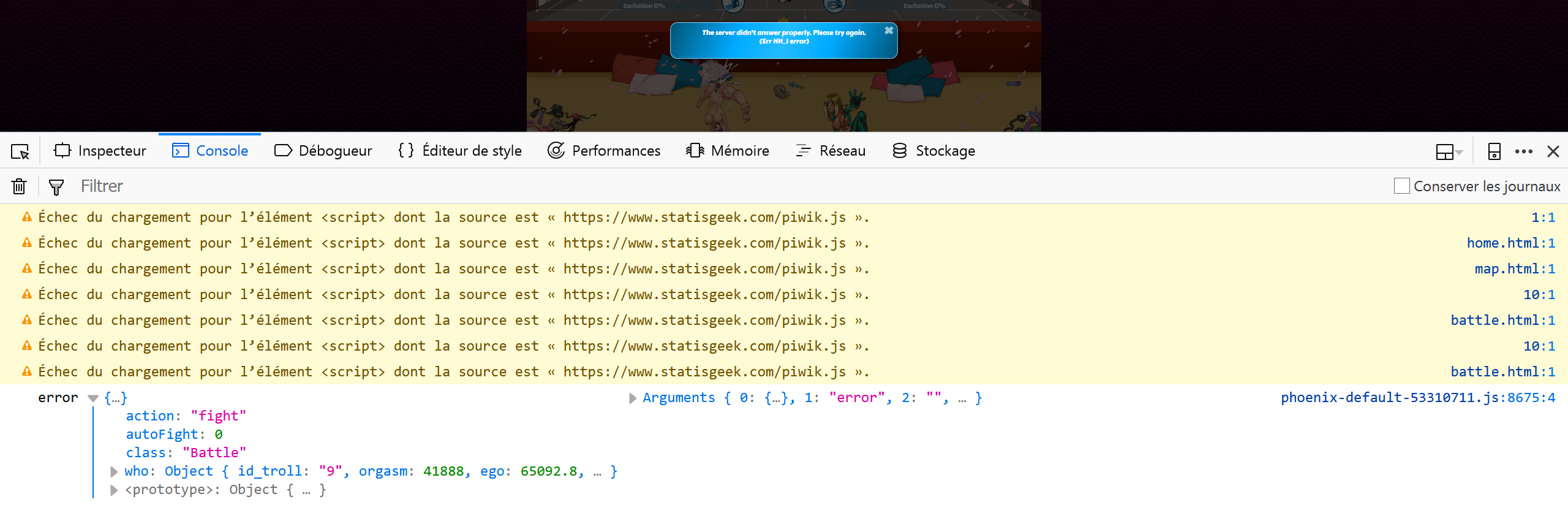 PlsDontTellMom Posted August 8, 2018 Share Posted August 8, 2018 Haha jsuis bête, le nom des fonctions de la stacktrace auraient du m'y faire penser plus tôt : c'est juste l'apparition de la console qui redimensionnait la page et déclenchait le script Il semble planter sur une page d'erreur mais ça n'est pas responsable de l'erreur HH1 ... Ce qui me fait penser que sur les screens, la console était ouverte après que l'erreur soit apparue. Or j'avais demandé dans ce post à ce que celle-ci soit ouverte en amont. Du coup, est-ce que quelqu'un pourrait : ouvrir sa console (f12) à l'onglet Réseau aller sur une des pages sur laquelle on peut effectuer l'action déclenchant l'erreur (harem ou la page du combat) vider la liste en cliquant sur la corbeille cliquer sur le bouton déclenchant l'erreur (avatar haremette ou bouton "Combattre") ... Et recommencer à l'étape 2 jusqu'à ce que l'erreur HH1 apparaisse, auquel cas poster un screenshot ici ? Link to comment Share on other sites More sharing options...
