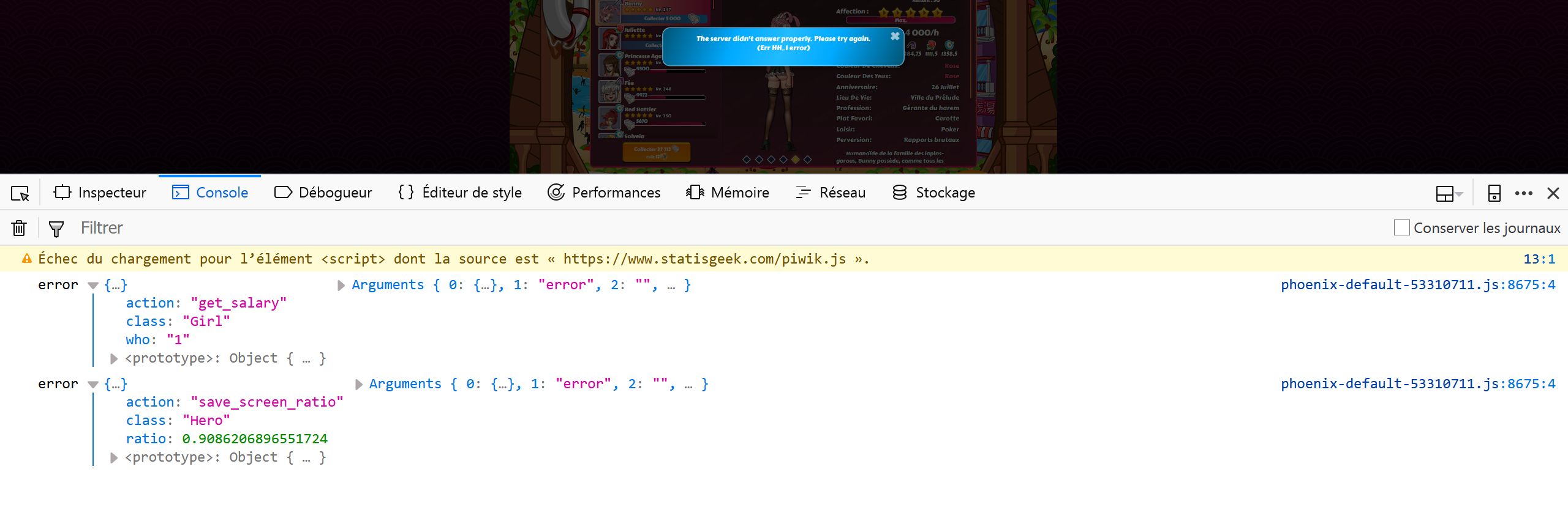 terreur32 Posted August 7, 2018 Share Posted August 7, 2018 il y a 43 minutes, PlsDontTellMom a dit : @terreur32 Merci pour les screens ! Celui qui m'intéresse le plus est celui avec "Réseau", j'ai jeté un coup d'oeil aux autres et il ne semble rien y avoir d'intéressant. Du coup, pour être sûr qu'on se soit compris à propos des actions à faire pour le screen : Aller sur la page où se trouve le bouton déclenchant l'erreur HH1 Ouvrir la console Aller dans l'onglet Réseau Cliquer sur la corbeille pour vider les éventuelles entrées superflues Cliquer sur le bouton déclenchant l'erreur Si l'erreur est apparue, screenshot ce qui est affiché sous Réseau (il risque d'y avoir plus que les 3 entrées que tu as posté dans la 3° image de ton dernier post) et le poster ici ; sinon, retour à l'étape 1 donc voici un screen HH1 avec console et ensuite réseau non corbeille et puis en restant sur réseau je clique corbeille et voici le screen juste après ensuite je vais cliquer sur le message erreur hh1 (en bleu) (et j'ai cliqué corbeiile sur console) et je vais continuer sans rafraîchir la page l'action que j'avais commencé ; je prélevais les salaires et tous les autres salaires sans problème je vais maintenant tenté le salaire hh1 pour voir ce qui se passe (je sais que pour l'avoir je dois rafraîchir la page)sans rafraîchir la page pas de message d'erreur mais pas le salaire non plus donc je rafraîchis page et je réessaye aucun hh1 je suis alors passé aux combats contre Rocco et retour erreur HH dont voici les screens (console réseau) pour l'onglet réseau comme je l'avais laissé actif il y a une tonne de ligne mais j'ai sélectionné les lignes css... et puis js en xhr je clique les corbeilles et le message hh1 et je vois ce qui se passe...je dois rafraîchir la page au sinon je reste avec la carotte qui bouge et le combat ne commence pas voici le screen juste après rafraichissemnt (pour l'instant avec l'été qu'on a ça fait du bien) 4,5 combats et retour hh1 dont screens réseau voila j'espère que le temps "perdu" et les screens serviront bonne soirée Link to comment Share on other sites More sharing options...