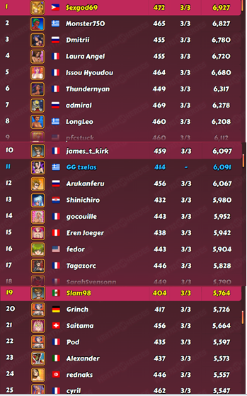 jelom Posted February 4, 2021 Share Posted February 4, 2021 This is the final result for this week. I did 6938 points for a good average of 22,90. I finished early, leaving only a handful of fights for the last day. Suzaku was second with 6869 points at a safe distance, in the end he was not so dangerous as I feared from past leagues against him. In the last day he was 1000 points behind schedule, and one hour before end he was still around 6100 points, rushing the last minutes. Mick, played very well as charm with Mithic Estelle, taking third place with 6804 points. My club mate Testiclese was 4th. I was able to pass the interval without KH Mythic girl as a KH player. 7 Link to comment Share on other sites More sharing options...