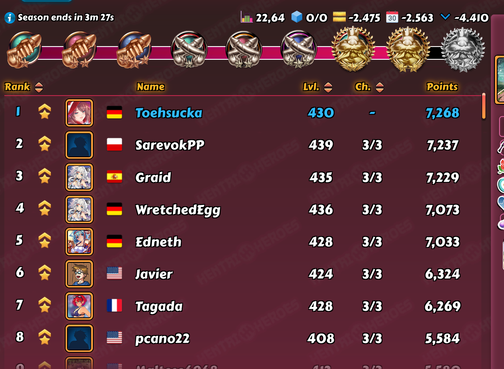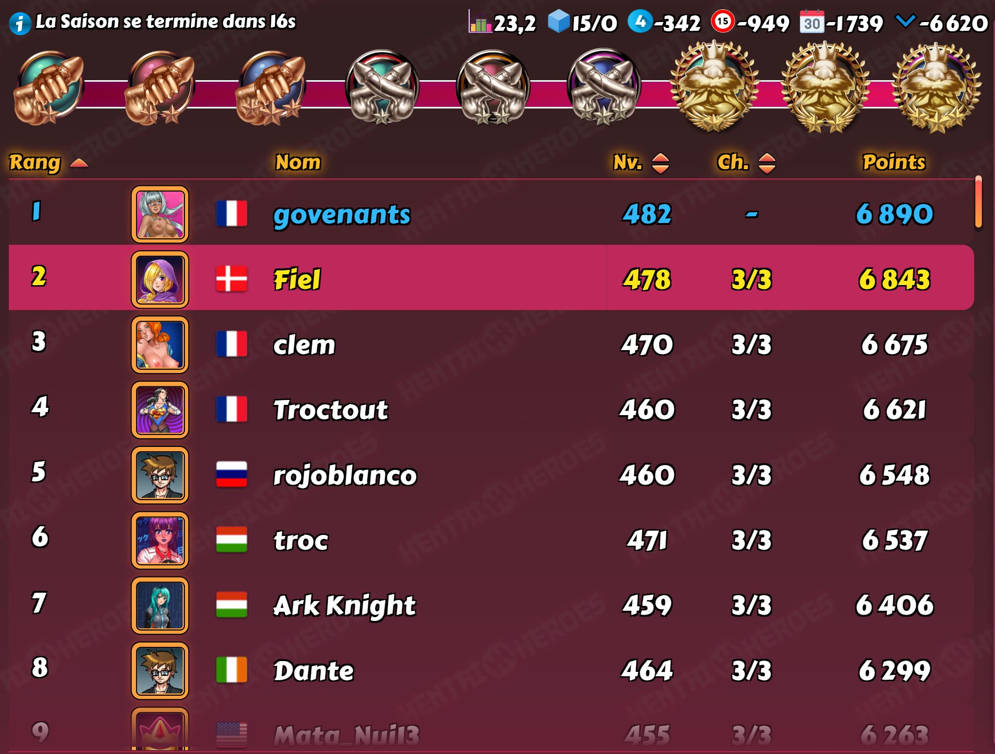 windia Posted April 30, 2021 Share Posted April 30, 2021 My D3 last week: this https://forum.hentaiheroes.com/index.php?/topic/7061-identifying-the-dicktator-league-brackets/&do=findComment&comment=228509 turned into these results: (screenshots taken ~5-10 min before end) HeH: got 5th with an average of 21,94 points/fight, no final level data, 2 losses while I had no hope that GrandPrice would drop his boosters for me to be catched, I waited for like 10-15 other dudes until the end - whom are not to be seen in Top9... HaH/nutaku: got 3rd with an average of 22,55 points/fight, final level range was 353-483, median 442 & average 453,14, no loss cato was this time "too" CHarming and won with my closest "failing" margin^^ - and I even catched him unboosted round lunch one day (Paris time) other (for me) perm boosters like bleeargh or Michael are at least resulting in Top9, 5 other dudes I waited for somewhere down the road further stats: 15/16th at 6351/6314 points, 30/31st at 5479/5396 points, 45/46th at 4690/4663 points 8 Link to comment Share on other sites More sharing options...