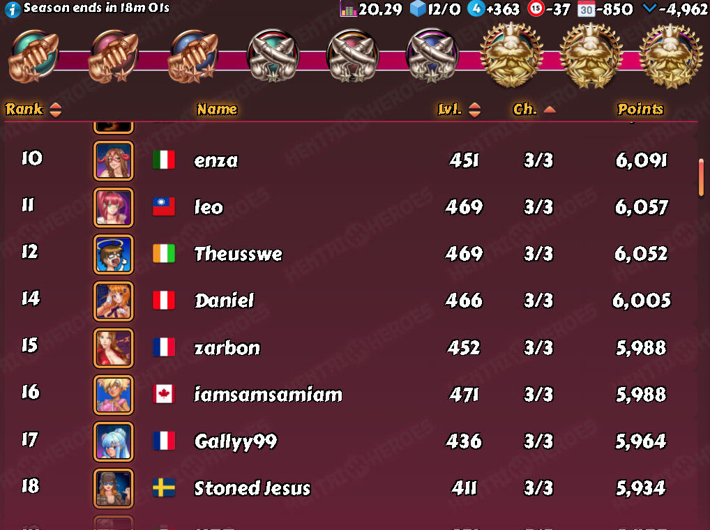 Moderator Kenrae Posted May 20, 2021 Moderator Share Posted May 20, 2021 This one was packed: After finishing my fights I saw myself in 2nd place after @Chthughaby one point and I cursed the tiny margin, but then wong7lee made a late small rush (a couple of boosted players I think) and my rage subsided 😂 I couldn't catch two players unboosted: wong7lee and shin. My average before fighting them was 22.9. This league was weird because I started with low level players for some reason and at some point I had an average of 23.35, it was fun to see . The second mythic girl helps a lot. Top players classes are CH, CH, KH, CH, KH, CH, CH, KH, KH. 8 Link to comment Share on other sites More sharing options...