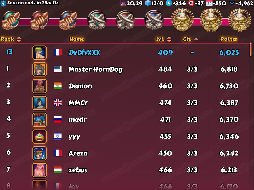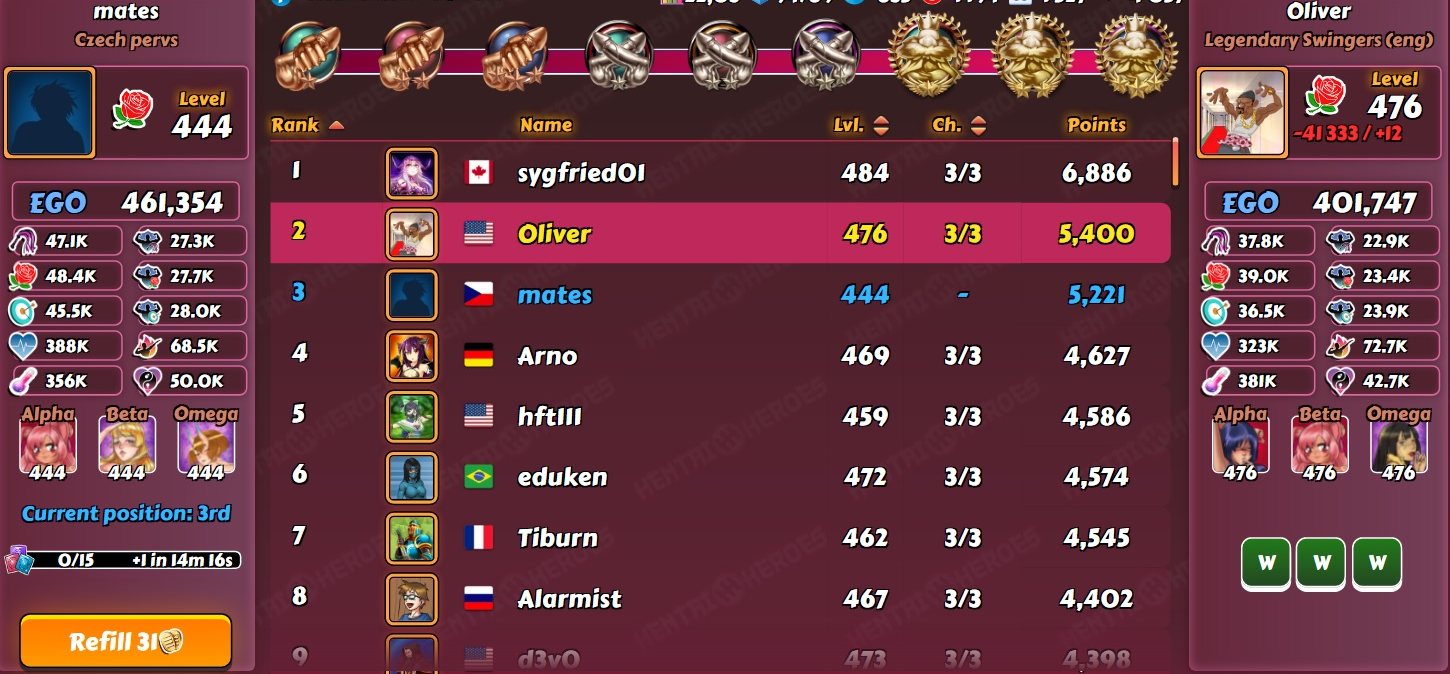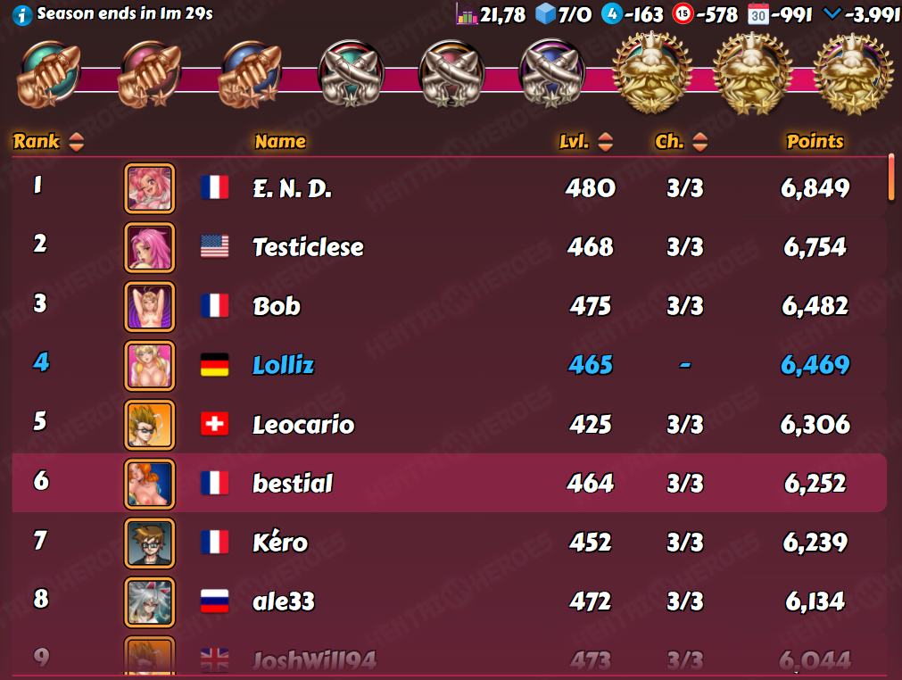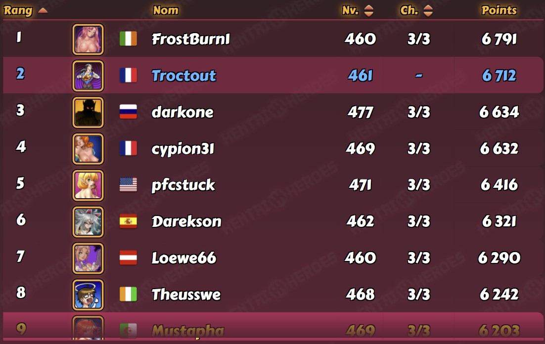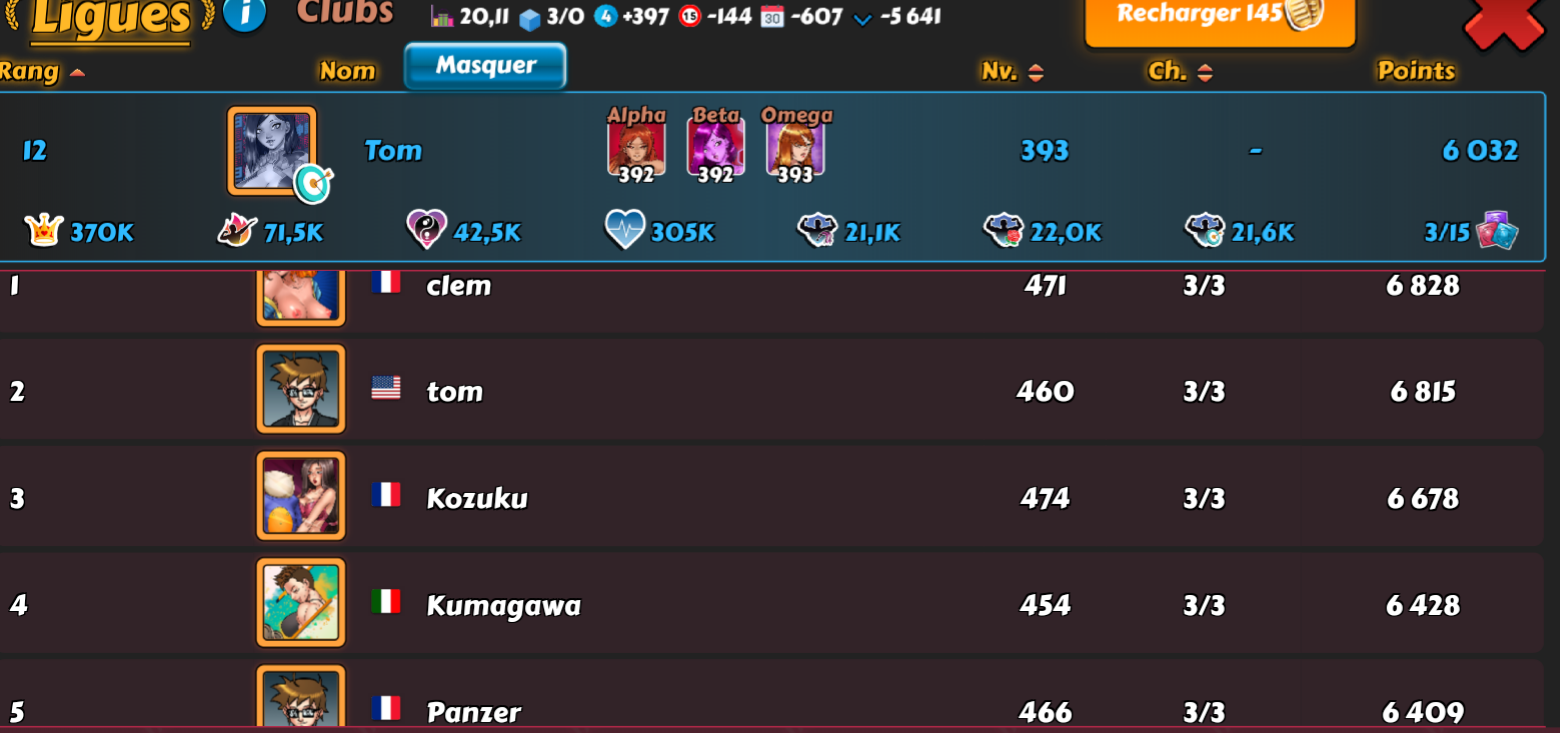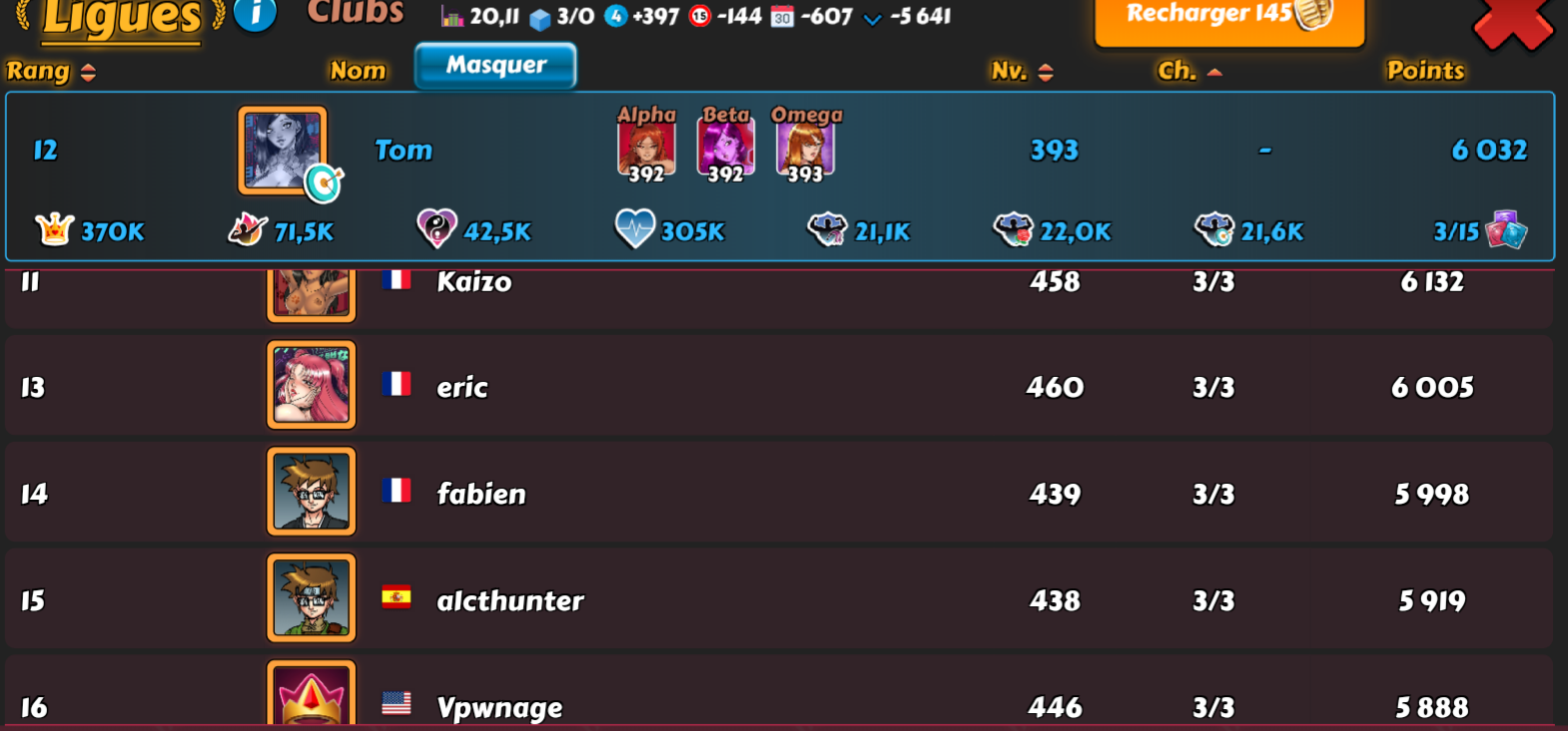 Tom208 Posted May 13, 2021 Share Posted May 13, 2021 Another week in D3, started at level 392, finished at level 393. Here are the screenshots taken 6 minute before the end (well, the usual end time, not the end of this league 😁 ) Final rank: 12th. Boosters used : 24 legendaries (3 cordyceps / 1 gingseng 6 times). 101 players -> 100 opponents -> 300 possible fights -> 300 fights performed -> 297 wins and 3 losses (against 1 player never unboosted: clem). Good average score (20.11) and 2nd top 15 since I started D3. I don't know if the 2nd mythic girl made that new top 15 possible or if I was just lucky to be in that league but whatever, I take it. We'll see if I can do that again next week. 10 Link to comment Share on other sites More sharing options...