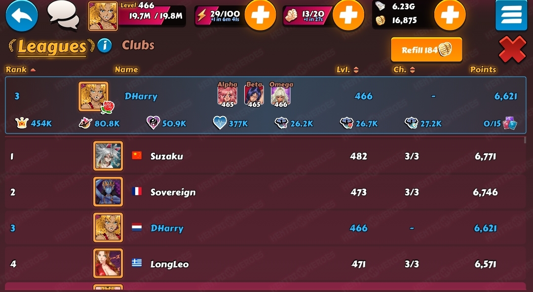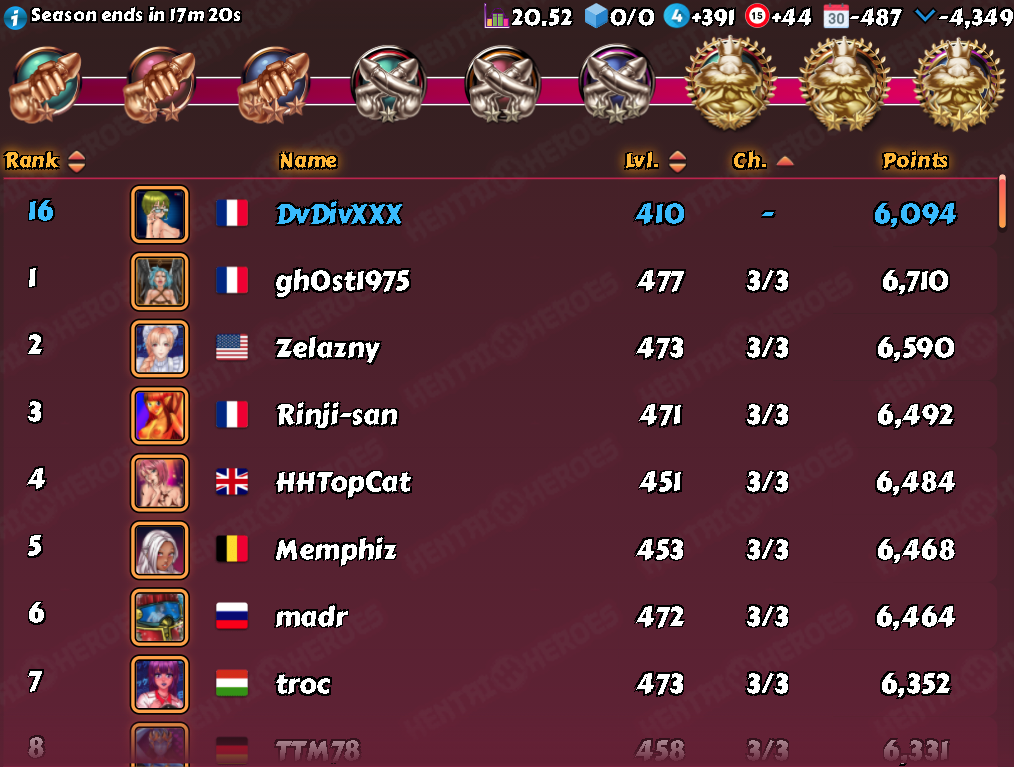 Tom208 Posted May 20, 2021 Share Posted May 20, 2021 (edited) Another week in D3, started at level 393, finished at level 396 (thanks to XP rewards in season). Here are the screenshots taken 3 minute before the end. Final rank: 15th. Boosters used : 24 legendaries (3 cordyceps / 1 gingseng 6 times). 100 players -> 99 opponents -> 297 possible fights -> 300 fights performed -> 290 wins and 7 losses (all against CH players). Not my best average score (19.91) but it was enough for a 2nd top 15 in a row. I guess it confirms the 2nd mythic girl helps a lot (despite the fact I'm not a CH player 😄). We'll see if I can do that again next week. @Slynia good luck for the league this week, I guess you're favorite for the top 1 at the end. I already took advantage you were not boosted this afternoon to fight you (and take 3 very short wins), thank you 😊 Edited May 21, 2021 by Tom208 14 Link to comment Share on other sites More sharing options...