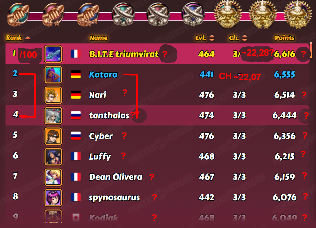 Chthugha Posted May 20, 2021 Share Posted May 20, 2021 9 hours ago, Kenrae said: This one was packed: After finishing my fights I saw myself in 2nd place after @Chthughaby one point and I cursed the tiny margin, but then wong7lee made a late small rush (a couple of boosted players I think) and my rage subsided 😂 I couldn't catch two players unboosted: wong7lee and shin. My average before fighting them was 22.9. This league was weird because I started with low level players for some reason and at some point I had an average of 23.35, it was fun to see . The second mythic girl helps a lot. Top players classes are CH, CH, KH, CH, KH, CH, CH, KH, KH. You had way more luck with catching people unboosted in that case. I have missed very few snapshots this week, and apart from shin and wong7lee (and you, but the last day you were glass cannon, which always gives decent points) I had quite a few low level players still that weren't unboosted. The thing of course is that they have atrocious stats even if they are boosted. Anyway, I was around the 22.9 mark for the entire round, sort of. I'm glad I wasn't until the end, because my average would have put me at 6792 or so. 1 Link to comment Share on other sites More sharing options...