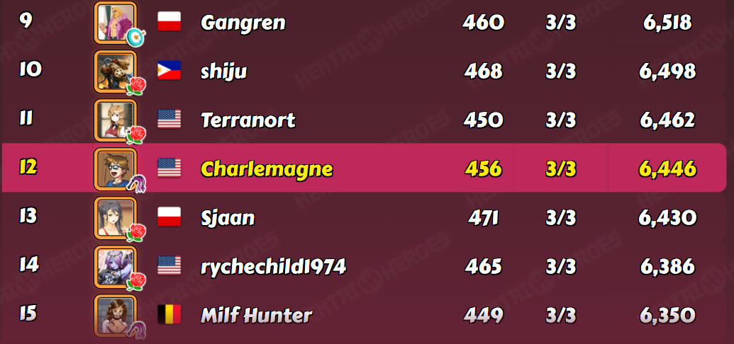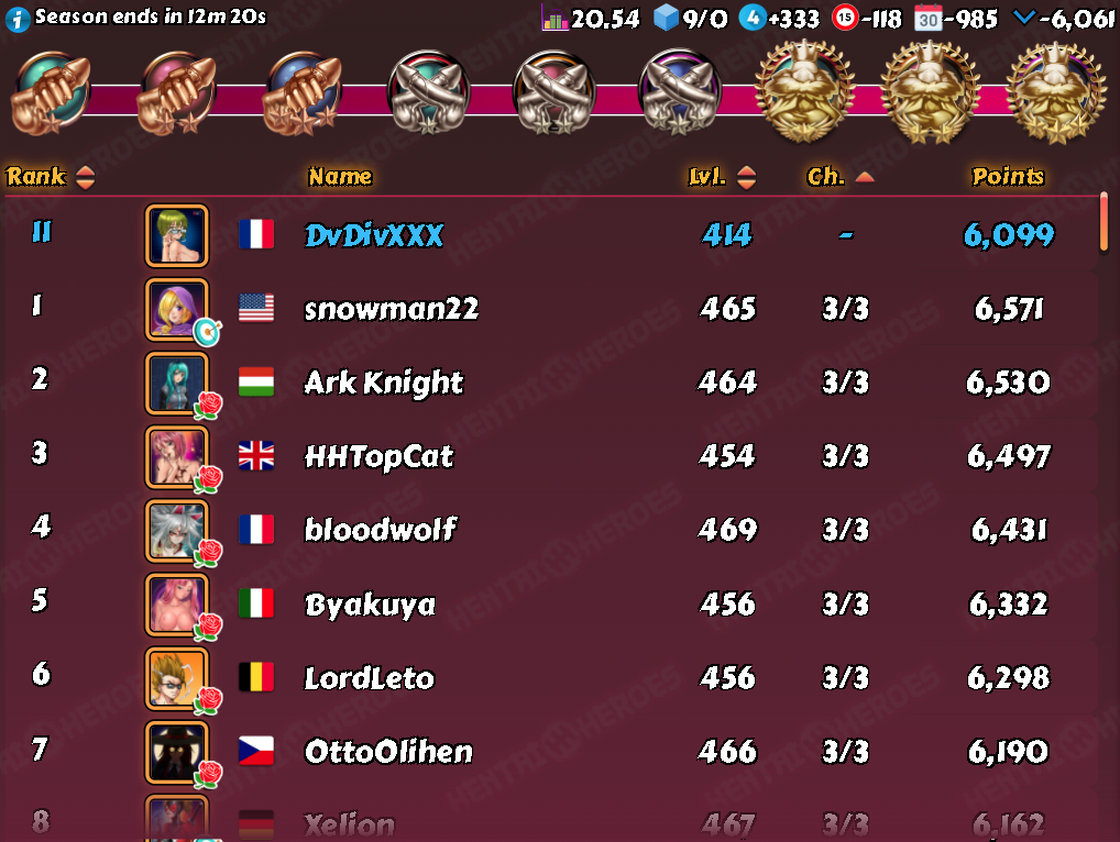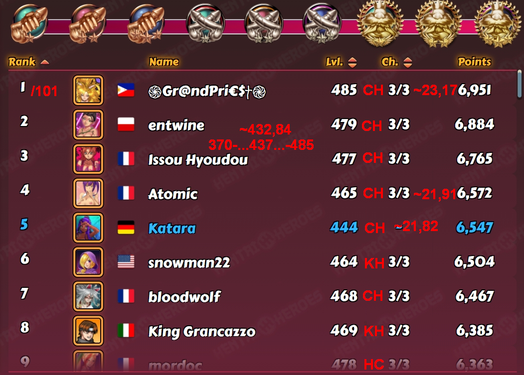 windia Posted June 10, 2021 Share Posted June 10, 2021 My D3 last week: this setup https://forum.kinkoid.com/index.php?/topic/7061-identifying-the-dicktator-league-brackets/&do=findComment&comment=232153 turned into that result: (screenshots 3 min before end) HeH finished 5th of 101 players, with an average of 21,82 while the final level ranged 370-485 with median at 437 and average at 432,84 i consider it a more tough week as I had like ~10 players left boosted until the end, got 6 losses GrandPrice took the grand price home^^ further stats: 15/16th at 5903/5852 points, 30/31st at 5506/5411 points and 45/46th at 5077/5021 points HaH/nutaku "einar geht noch, einar geht noch rein.." = it was just me being the bigger fish this time 😋 as a child I never heard the full song and thought it is about drinking^^ and I was quite happy to see I was the last of the Top4 to do all of his fights finished 1st of 101 players, with an average of 22,50 while final level ranged 339-480 with median at 439 and average at 435,49 further stats: 15/16th at 5855/5843 points, 30/31st at 5440/5398 points and 45/46th at 4991/4958 points and when I go down the list I see how often the rl might interfere with the D3 wins - so many high lvls somewhere in the nowhere... well, I'm taking advantage of it now, might they take it back when I don't play 10 Link to comment Share on other sites More sharing options...