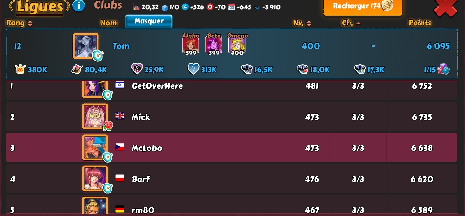 mates Posted June 17, 2021 Share Posted June 17, 2021 This one is from last week. I was away for a whole week from monday to sunday. So I've done many refills to finish on monday. I've had to fight 3 players boosted and finished with 22,23 This week I've started to play on sunday. At first I thought I would go easy just to finish in Top15, but later I realized I might have a shot for Top4, so I started to care a little bit more and it paid off! I've had to fight 5 players boosted, lost two fights with Papermoon and finished with 22,19 Nice score buddy @windia were you playing some games with me or do you usually use Fanny and Fione as Alpha? 8 1 Link to comment Share on other sites More sharing options...