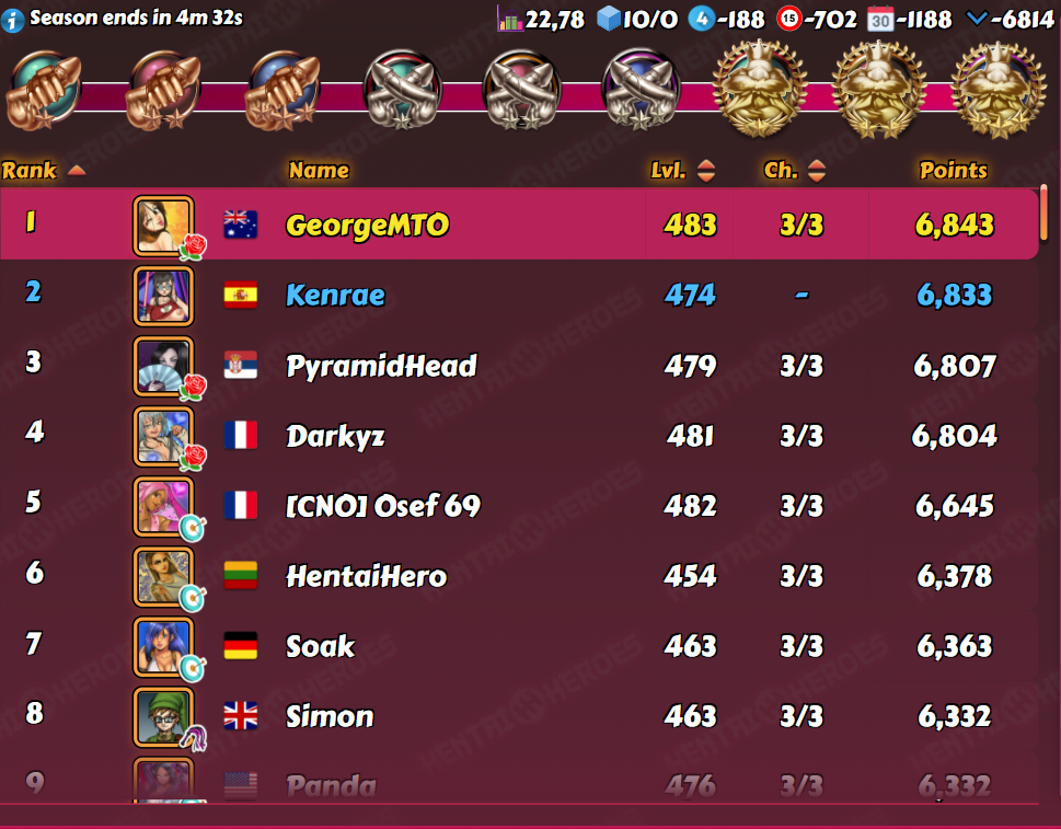 windia Posted June 17, 2021 Share Posted June 17, 2021 (edited) My D3 last week: this setup https://forum.kinkoid.com/index.php?/topic/7061-identifying-the-dicktator-league-brackets/&do=findComment&comment=232979 turned into these results (screenshots 2 min before end): HeH: got 4th out of 100 players with an average score of 22,12, final lvl range 323-482, median at 434,5 and average at 429,45 had like 15 players left "boosted only" ( since I approached them the first time...) - yet no loss 🙂 as I finished early the day I'm quite happy that most others also already finished^^ HaH/nutaku: got 2nd out of 104 players with an average score of 22,78, final lvl range from 350-482 with median at 441 and average at 434,17 scrolling through the setup at start, I did overlook a "czech pervert" aka @mates which I feared to beat me^^ - luckily I "tamed" him on 3rd place^^ - congrats for that result! PaperMoon appeared permaboosted and went very early far ahead - yet closing in yesterday evening. At this point I knew I "lost" because 27 points are a very unusual result for a fight^^ (yes, I play a game - and each time I finished league tokens, I switched girls to upgrade my legendary CHarem for free with kisses... 😉 Edited June 17, 2021 by windia 10 Link to comment Share on other sites More sharing options...