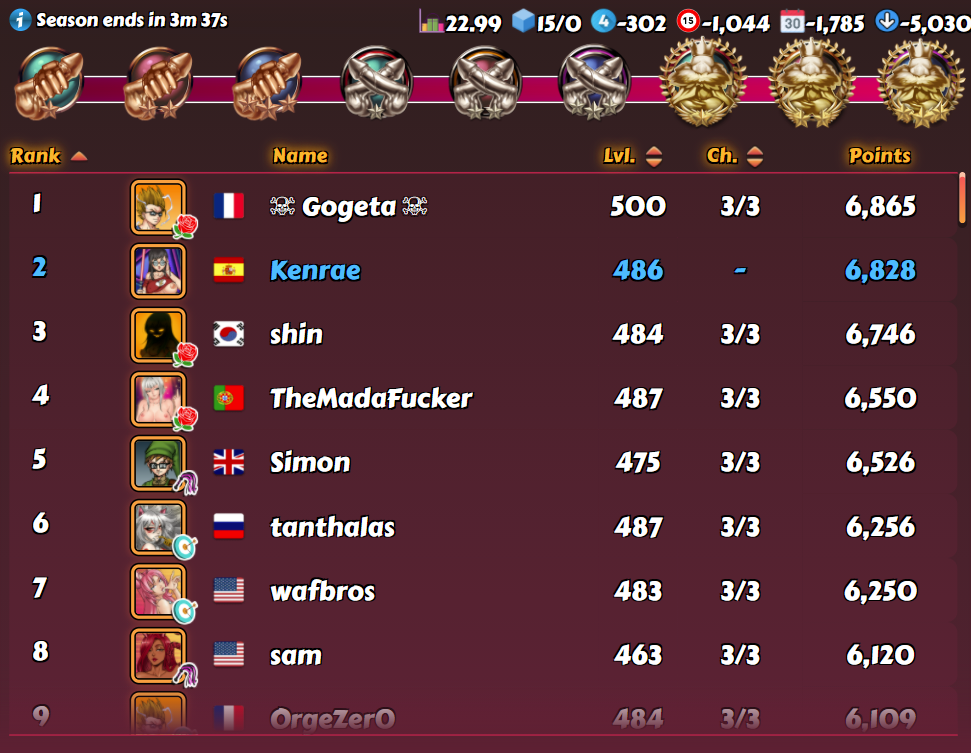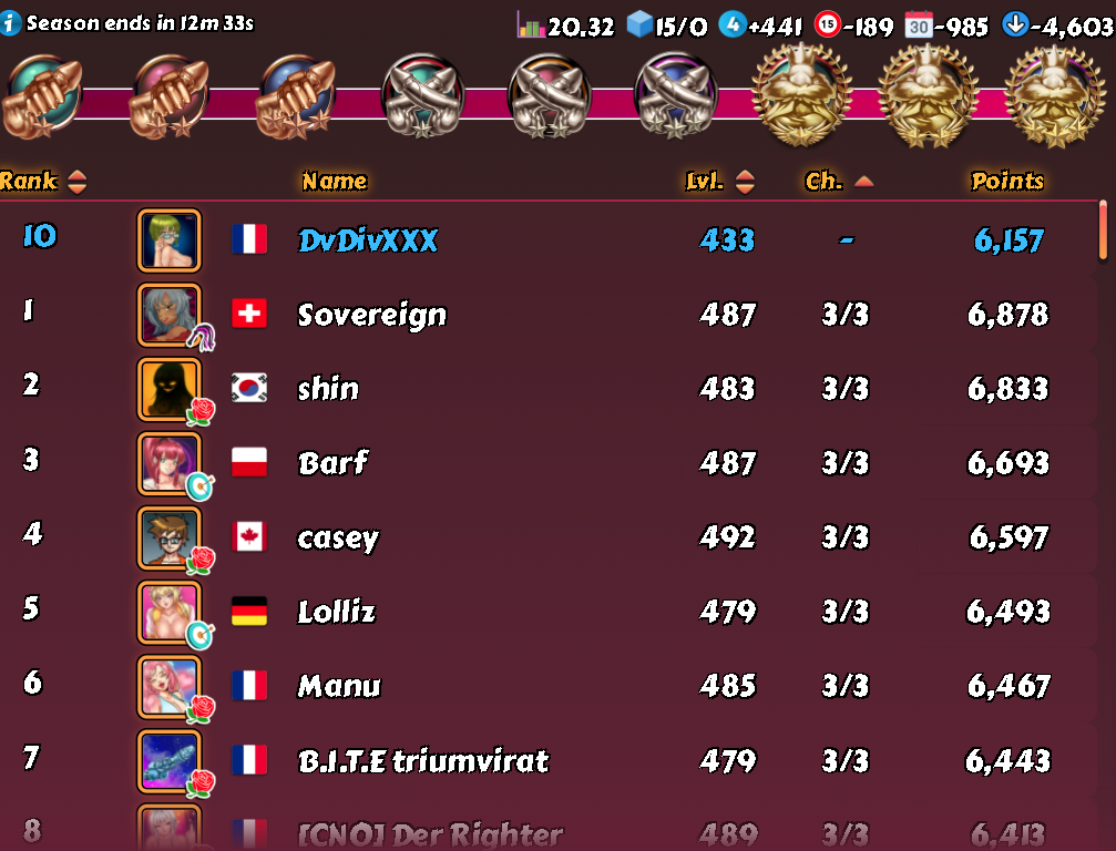 La Kajira Posted September 30, 2021 Share Posted September 30, 2021 That's...actually better than what I expected. Not a top 4, but none of the numbers look unbeatable once I get a few more levels. Thought the gap would be bigger. But, damn...everyone and their grandmas were permaboosting. Had to take 9 people boosted, 5 of which are on the screenshot. Somehow miraculously only lost a single match there (against Doominica). Aaaand the current league looks only marginally friendlier. Charming. Time to congratulate vampirash on the victory 10 Link to comment Share on other sites More sharing options...