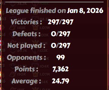jelom Posted September 16, 2021 Share Posted September 16, 2021 Congrats to GrandPriest for his win: 7154 points (23,84 avg). I could only get 7054 points and 23,51 average. Tatouf Metouf was a bit behind, and our professor Chthugha was 4th. Tony got a 6th position at level 446. I cannot say that I like the new mythic booster, because it demands stopping the season fights to use it to full effect, but it seems many people is using it anyway. 7 Link to comment Share on other sites More sharing options...