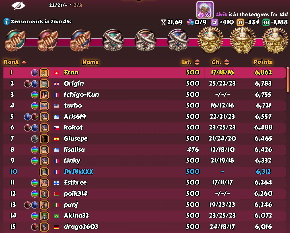 Moderator DvDivXXX Posted February 23, 2023 Moderator Share Posted February 23, 2023 ------------------ D3 run #130 2023/02/16-23 (Livia Week 3) Well, I've taken a few losses and ended up missing 18 fights altogether. Couldn't play before reset. So Top 30 for the first time in I don't even know how long. Honestly, I'm getting way out of it. It's becoming harder and harder for me to care at this point. On top of that, the difference in kobans and shards between top 30 and top 15 isn't as big as I remembered. Maybe taking the top 30 instead of paying for refills to play every last defeat and stay in top 15 would actually be a net benefit in my current situation. Good luck have fun this week, folks. Stay safe! 11 Link to comment Share on other sites More sharing options...