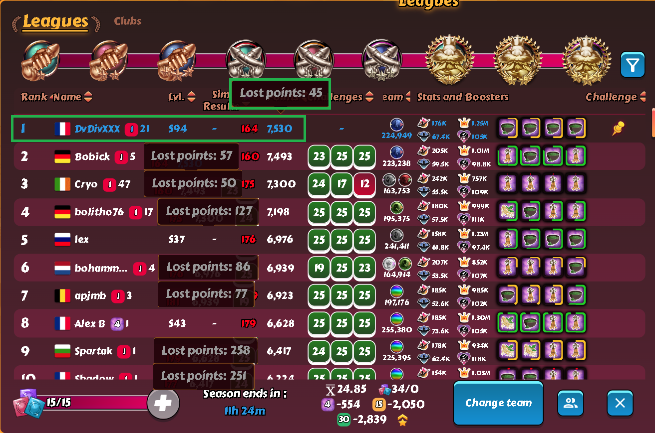 XXDongXX Posted December 21, 2023 Share Posted December 21, 2023 (edited) luckily an easy league for for me. Only one other player that had reached a first place in League before. No surprise he is on second place. I could only play on mobile from saturday to monday, so i missed blessings change and had to buy a lot of refills. [FDGN]Arkore did nearly all fights until monday evening so i had a clear aim, how high i must score. I used a partly blessed blue eyes team with undercover valentina for shield and royal housemaid for stun. Crasy high AP, for the vast majority of fights i hab to do it was not relevant if the emeny team was boosted or not 🤣, but again this was an easy league. Edited December 21, 2023 by XXDongXX 5 Link to comment Share on other sites More sharing options...