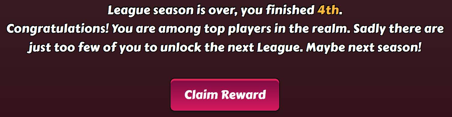 Horsting Posted December 14, 2023 Share Posted December 14, 2023 (edited) Top 4: Oh, and someone else jumped above me in the last minutes, luckily just 1: I could only benefit from 2 blessed girls this week, and the hard fights just started in phase 2, with quite a large number of fully/mostly skilled strong opponents. To have any chance, I'd have needed to do all non-25 fights in phase 1, where I had a quite strong team. But top 1 would have been out of reach anyway, I guess. Next week, blessings are weak in general, so I should perform better. 1 hour ago, bolitho76 said: I had often strong opponents where the booster run out but the stats woudln't actualized. And I have the impression this bug worsened much: It was about every 2nd opponent here (where I waited for booster expiry). Also the average time after which the stats are actually updated is much longer, over 2 hours once. Of course many opponents apply new boosters in the meantime. On the plus side: The booster indicator without timer has been removed it seems. Never saw it since a while. So when boosters expire, the indicator is definitely gone. But it remains an unreliable indicator, that helps you only when you can hog the league and check back every 5 minutes, of every 15 minutes (doing champs in the same turn) ... Edited December 14, 2023 by Horsting 1 2 Link to comment Share on other sites More sharing options...