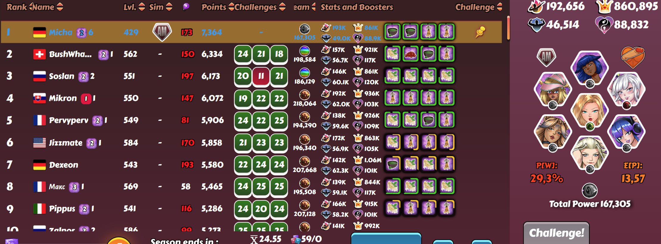 Horsting Posted December 20, 2023 Share Posted December 20, 2023 (edited) I finished this week a day early: 136 points lost, 24.55 average, not my best score, but I expect it to be sufficient for my first D3 win. The competition was/is quite low, only 3 previous D3 winners overall, two of them in chill mode and with only limited girl skills. The one lost fight was with a 0.71% chance to loose 😒. He was one of the two opponents I could not catch unboosted, since they both renewed their boosters immediately every day, and I do not expect this to be different this last day. Also I am negatively surprised that most top 4 contenders do not understand how GS5 works. Most have many same element (orange) girls maxed, including an M6, but the M6 not in the right position, but an L5 instead, some even a completely unskilled one while they have a maxed M6 with GS5 in the team. While I am happy for my likely first win, it destroys the fun of a fair competition. With GS3 it is similar: I am literally the only member of the whole league bracket who took care about GS3 synergies. All others built their teams on the (weak) blessings, building a mostly or full orange team with often GS3 skilled, but nearly no trait synergies. For this reason I have literally the strongest team in the whole league, despite my limited harem. Not the strongest opponent though, since my low level results in lower defence, harmony and ego. The only other two stronger teams are visible above, which do not reach my AP despite using more Cordyceps. No one went for the stronger possible teams with a mix of GS3 and blessings synergy, I found above: Lucky me 😅. ... sh**, I was writing about this risk just yesterday, and now ran into the trap myself: Goodbye perfect PoG score 😄. Edited December 20, 2023 by Horsting 1 3 Link to comment Share on other sites More sharing options...