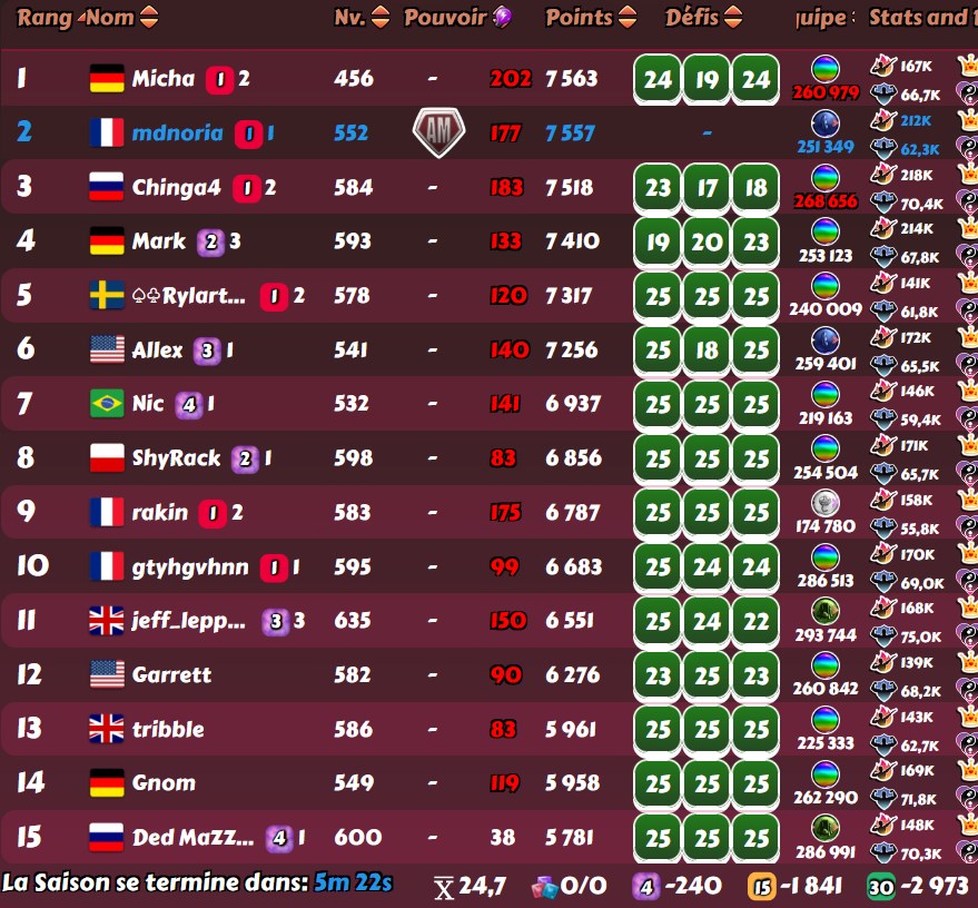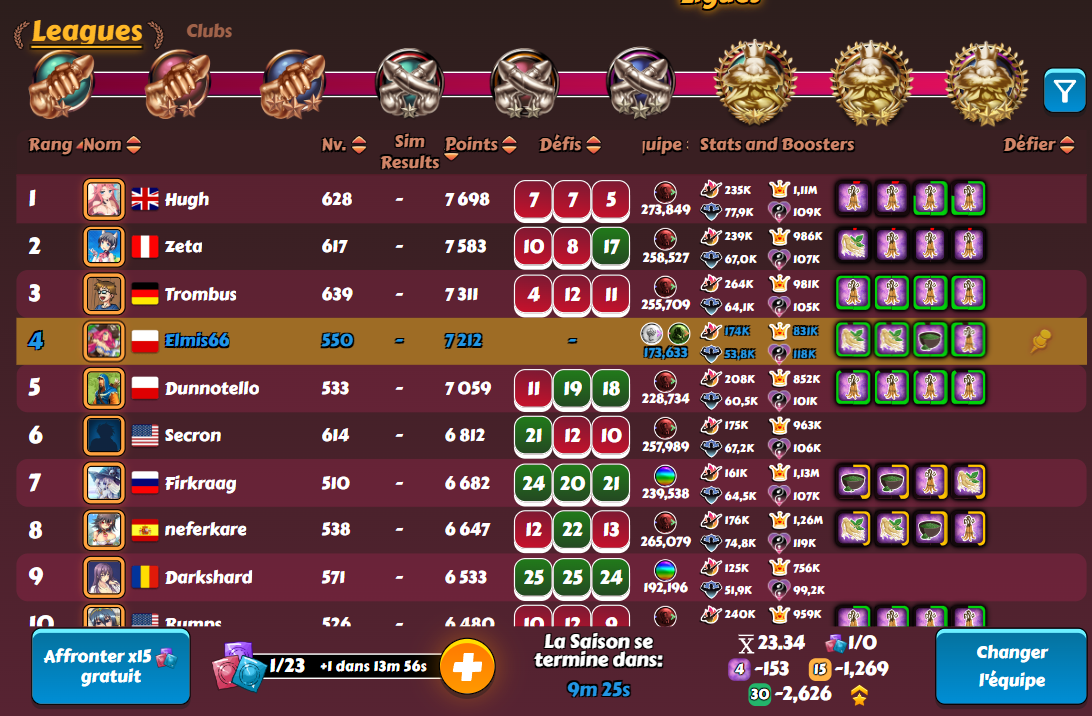 mdnoria Posted February 22, 2024 Share Posted February 22, 2024 (edited) Previous league from 08/02 to 15/02 results : ================================ Finished 3rd, and didn't do all my fights but top 4 was guaranteed. I also didn't optimize much during the week as I was on ski holiday with a friend so I preferred to spend time on the slopes instead of on my phone. Wasted nearly a full AME on season fights because I forgot about DP and did not wanted to be stuck on tasks asking to do season fights or gain mojo because of it. Also got the new league girl this week. ====================================== This week league results from 15/02 to 22/02 results : ====================================== I finished 2nd, using 1 LME and 1 AME. Strangely, I thought Rylarth had a shot at top 4 from the lost points I tracked. After the blessings change, I went with a full mythic team but since I could only skill 3 girls, I changed it for a 3 mythic, 3 L5, 1 R5 around the blessed pose instead which seemed to work better. Edited February 22, 2024 by mdnoria 1 9 Link to comment Share on other sites More sharing options...