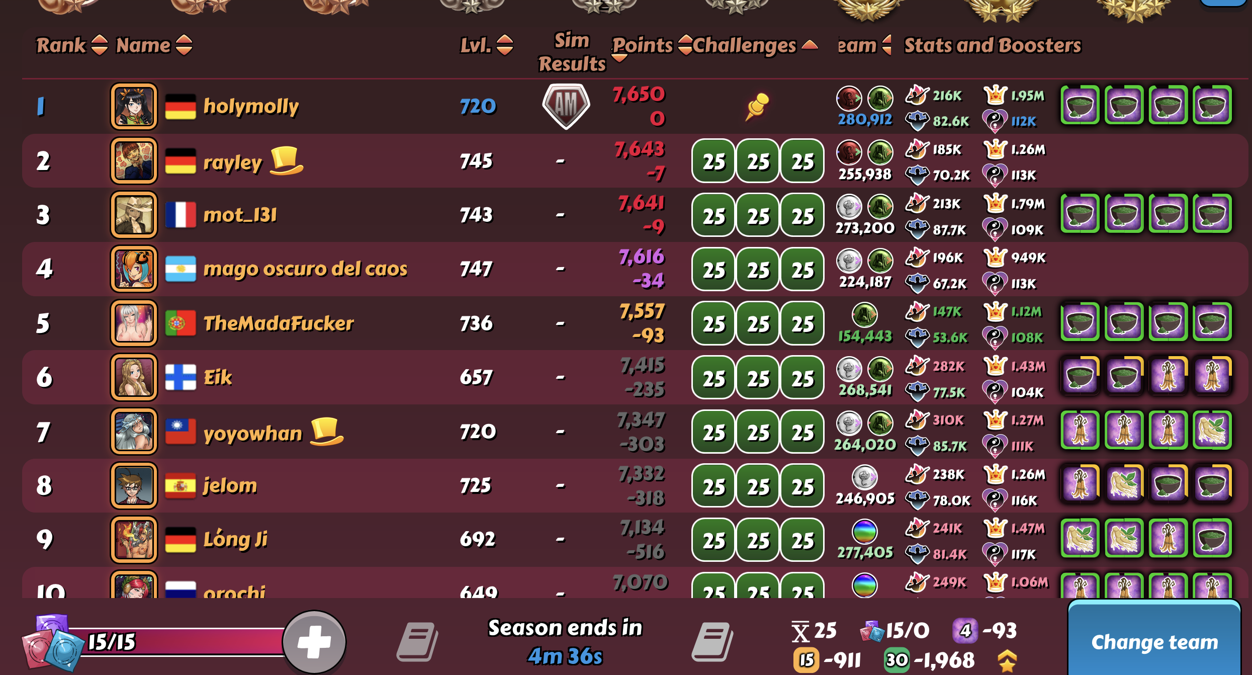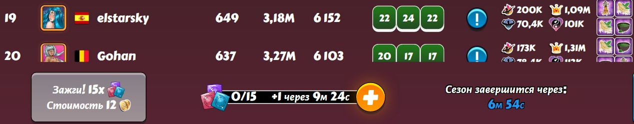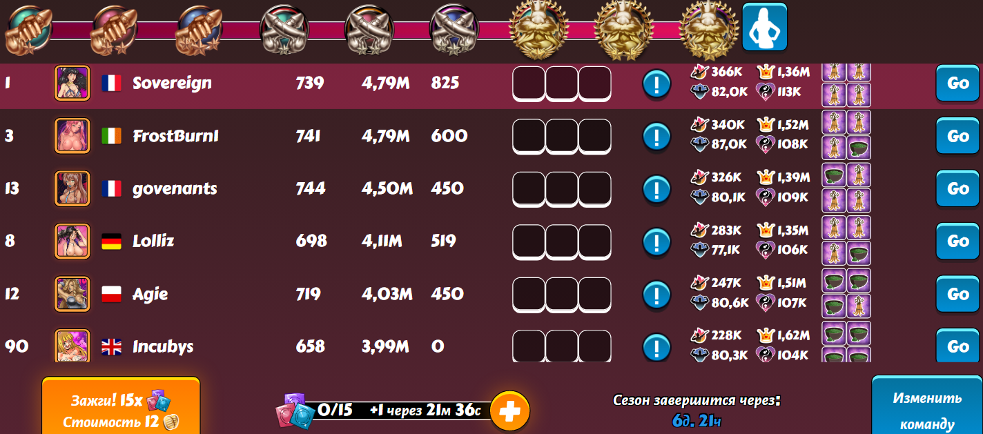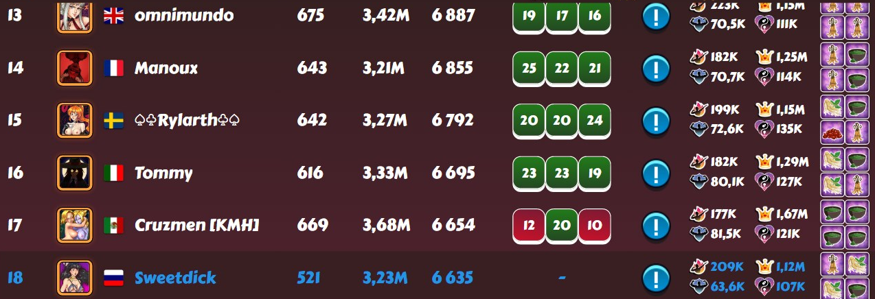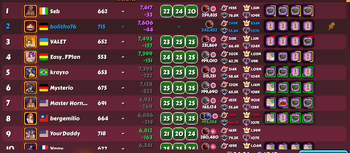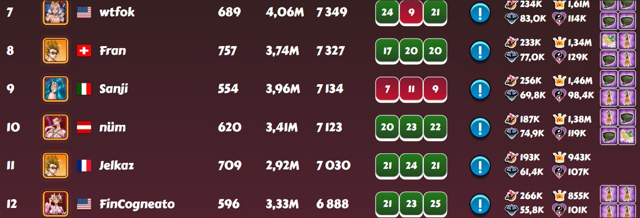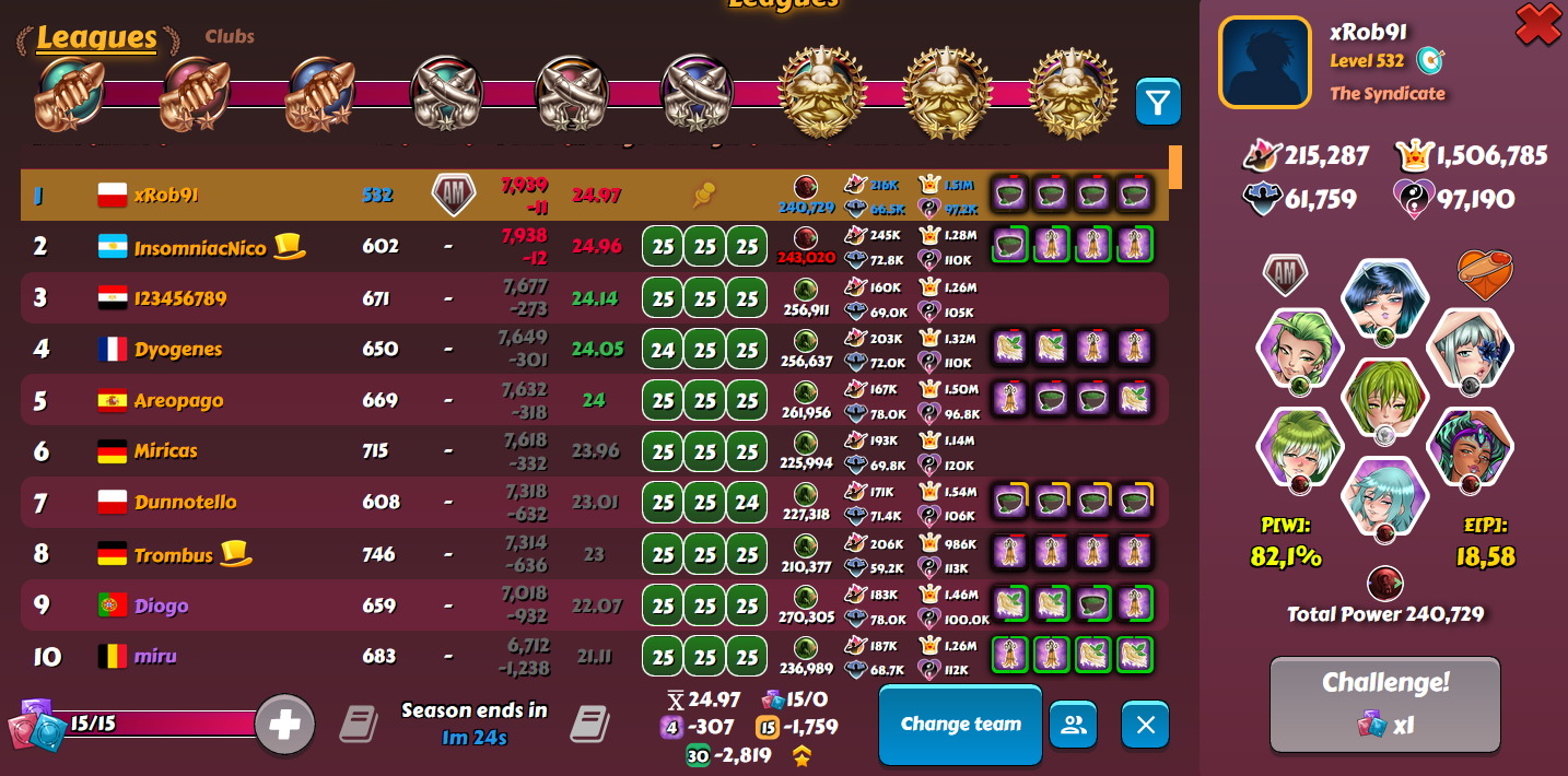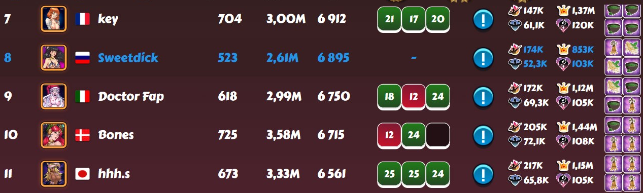 Vovantillo Posted May 15, 2025 Share Posted May 15, 2025 After the disastrous last week in the D3 league and my 18th place. This week I was extremely focused and attentive. And the RNG rewarded me for my efforts. As a result, 8th place and another top-15 in the D3 league. I did not use boosts and additional attempts, as usual. I am already wondering if the time will ever come for me to use at least one boost at the end of the tournament week.... For now, everything suits me, based on my level of harem and character development. 1 5 Link to comment Share on other sites More sharing options...