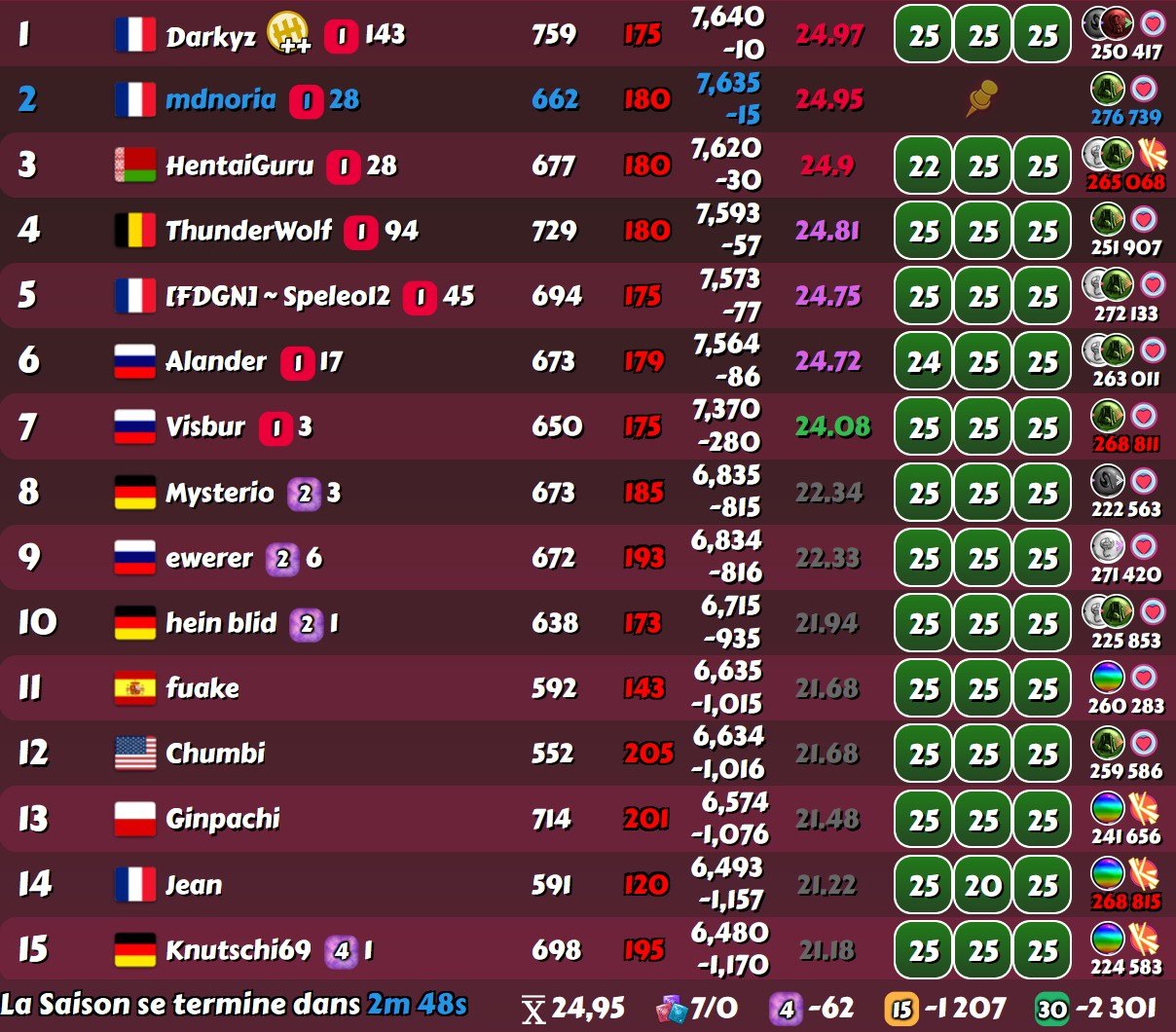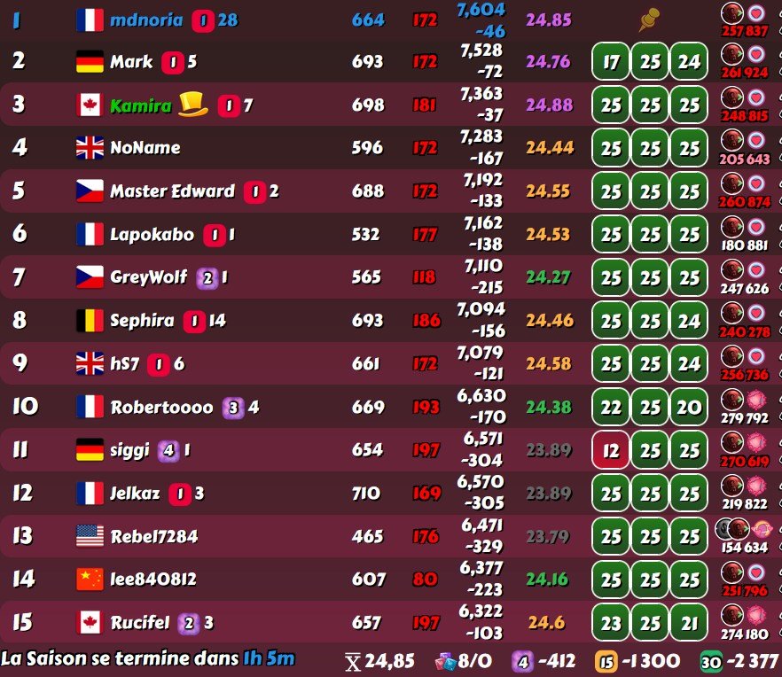 Vovantillo Posted May 8, 2025 Share Posted May 8, 2025 (edited) Thanks to Bolitho76, I was also worried about your position. These two points are between 4th and 5th place. I don't use scripts and therefore I can't see if a player has any more attempts to fight. I myself was unlucky at the end of that and the beginning of this week with blessings. And our group was not weak and actively playing, so I tried to do as much as possible, but at the beginning of this week I made a lot of mistakes playing according to the old strategy. And I unreasonably lost a lot of points that I could have picked up after changing the blessing. But I'm not upset, 18th place in this group suited me just fine, just a little bit was missing, but that's because of my miscalculation. So let's move on. Fortunately, everything is over there now. And new achievements await us... Here's the final breakdown with 6 minutes left. *Addition: In the upcoming league, I also got serious guys. I think many met them, and after that sharpened their grudge against them))) So, in all likelihood, this week I will also have to give up the top-4 (joke). And try to cling to the top-15. Edited May 8, 2025 by Vovantillo Addition 3 1 Link to comment Share on other sites More sharing options...