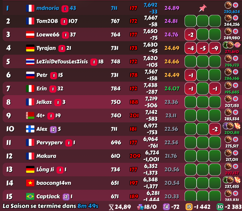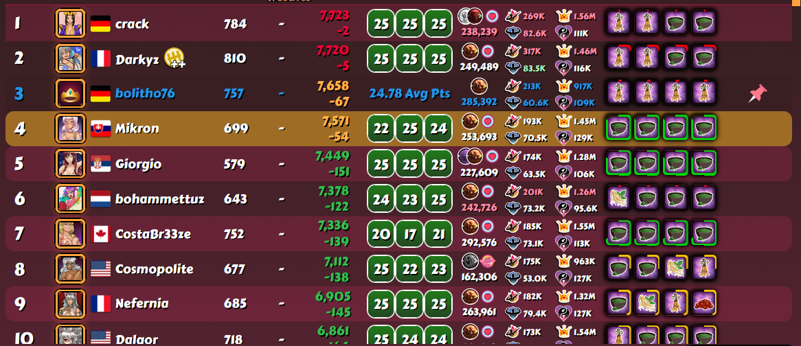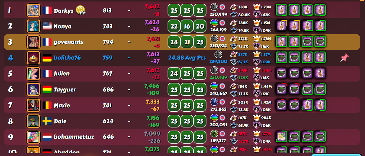 jelom Posted November 27, 2025 Share Posted November 27, 2025 Contrasting with my 6th victory in CxH league, in HentaiHeroes I could only be 13th. Top 15 never was in danger but obviously it is not a good position. Anyway, Top15 is the most you can expect without mythic boosters and a permanent team, so I am content with it. 3 1 Link to comment Share on other sites More sharing options...
