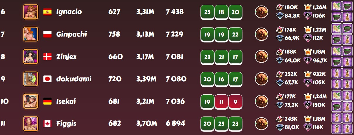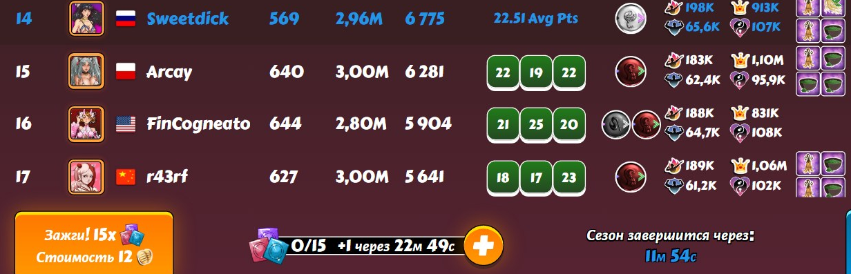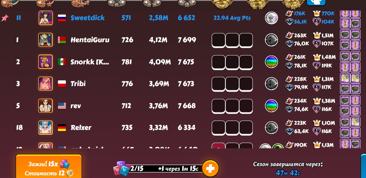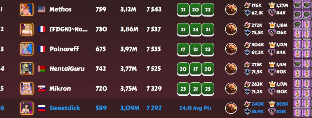 HentaiGuru Posted December 4, 2025 Share Posted December 4, 2025 (edited) How it started in monday And how it ended today I bought ~90 fights during reset time because my red-haired team with 3 Exibitonista gave me advantage against previous week Physical setup - and one missed rebuff time click worth me same lost points as all week before... Next it was just my base luck on last page - i lost at every weak roll i can lose 😧 But what ends well - ends well Lisalisa spent even more than me - so it is an expensive top4... See you nex time, sex cowboys 😀 Edited December 4, 2025 by HentaiGuru 5 Link to comment Share on other sites More sharing options...
