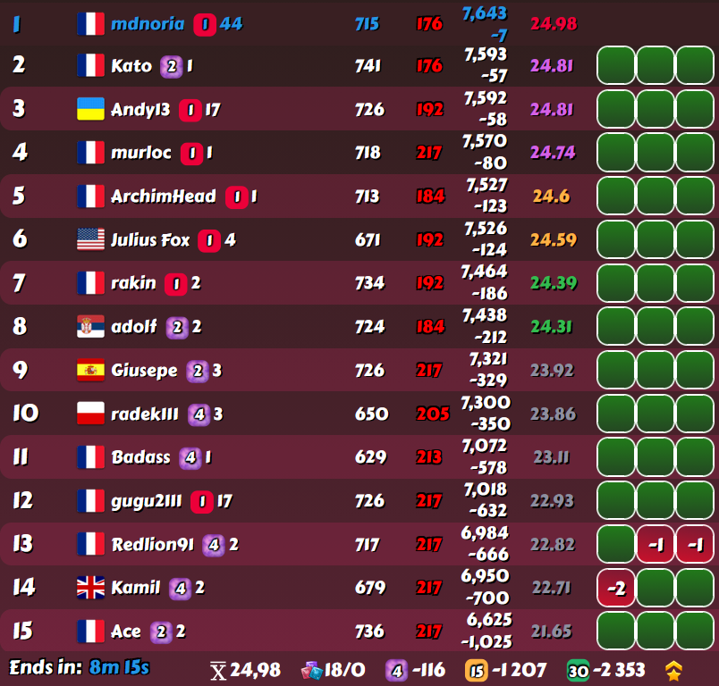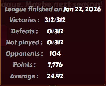 Moderator bolitho76 Posted December 4, 2025 Moderator Share Posted December 4, 2025 The game lagged such a long time to open the League page that I couldn't take a screenshot from the bracket. Rena was the only relevant opponent this time. For a long time it seemed, that rena would win this bracket. Until this moring, rena had lost "only" 14 points, while I had 32 lost points. But I had done all my fights, and rena had some more to do. Some hours ago did rena a bigger bunch of fights and increased the lost points to 30 with this. From this time, I had hopes for a win again after the difference were only 2 lost points. In the 5 minutes before reset, rena did the last possible fights and lost at least 2 points, or ignored the last fights so that I remained at 1st. 4 Link to comment Share on other sites More sharing options...