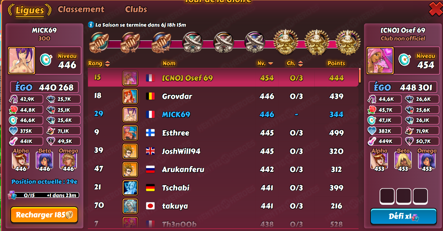 Moderator Kenrae Posted October 1, 2020 Moderator Share Posted October 1, 2020 New D3 with 101 players. Levels 338-462, median 410: [CNO] Cadmos 462 CH 4 wins Link 452 CH 9 wins Aure 449 KH 19 wins Totor 448 CH 1 x 2nd StormAnimal 446 KH 4 wins rom1 445 HC 1 x 6th Trichelieu 442 KH 1 x 2nd Ouragant 441 HC 1 x 12th Gauthier077 440 KH 3 x 4th chenpaul 439 KH 1 win Caine 439 KH 4 wins Good luck everybody! 3 Link to comment Share on other sites More sharing options...