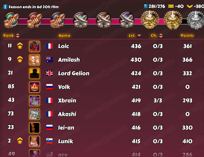 Moderator Slynia Posted October 1, 2020 Moderator Share Posted October 1, 2020 D3 with 100 players. Levels 334 - 454. I am with @Ira who ended up 2nd in my last league again, this week he will surely grab another top 4 again. anony76 451 KH x2 Wins mordoc 448 HC 7th Ira 445 KH x8 wins madr 444 KH 1 Win gaston 444 KH x2 2nd Hosaris 444 HC 10th krishka 444 KH 5th Apocesis 440 KH x2 2nd ---------------------------- Aquilon 440 CH 2nd phunter 439 KH 1 Win Laura Angel 438 KH x3 Wins advocatus_diaboli 433 KH 2nd Rafy 428 KH 3rd Bottom of the bracket: Good luck! 3 1 1 Link to comment Share on other sites More sharing options...