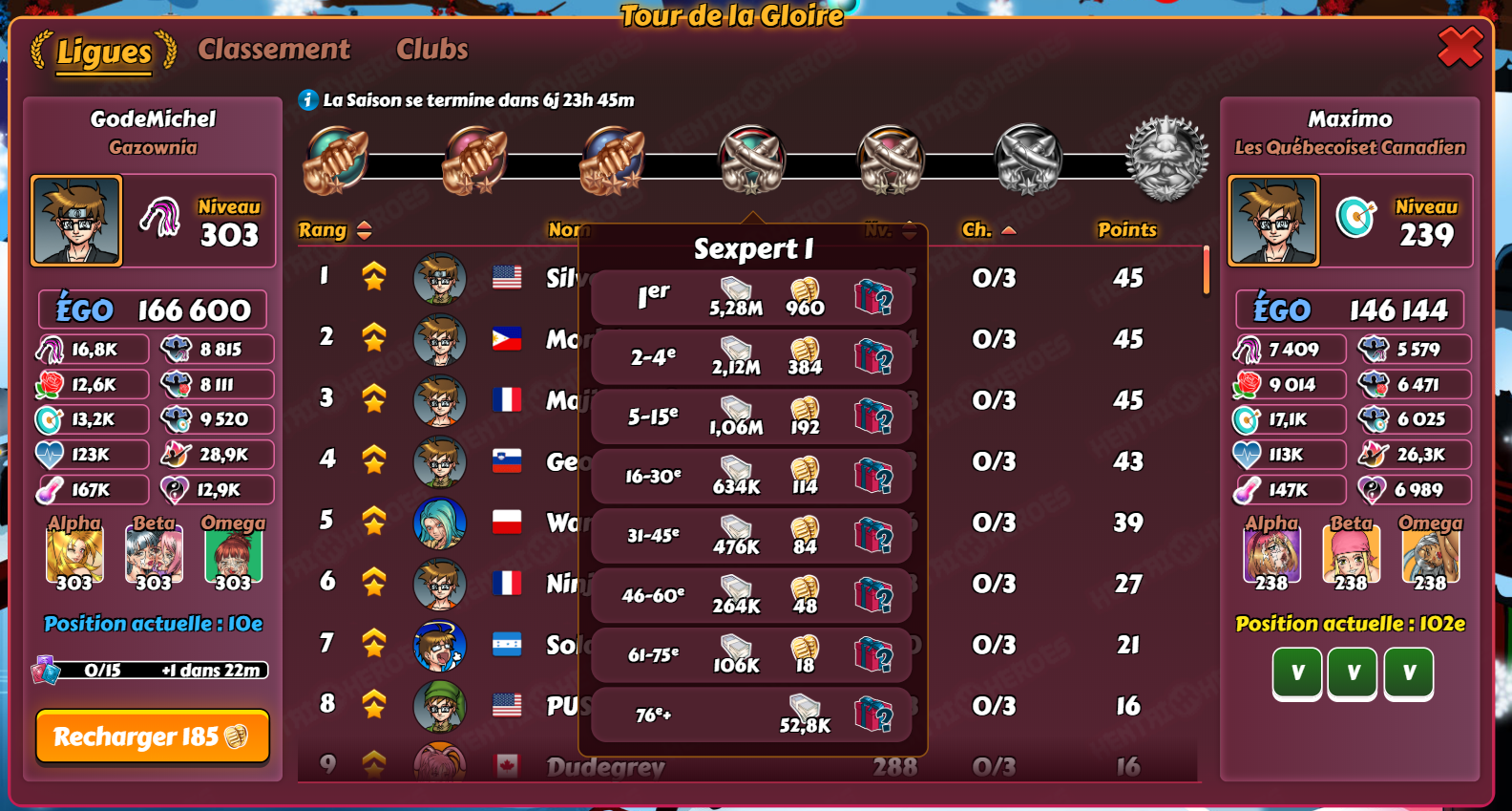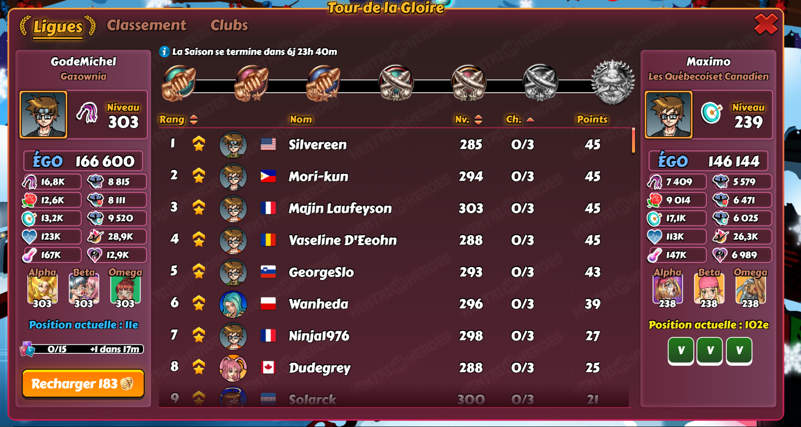 GodeMichel Posted December 6, 2018 Author Share Posted December 6, 2018 (edited) il y a 4 minutes, gangsterofluv a dit : On a continué avec le solde de la saison précédente au lieu d'être maximisé. Idem sur le serveur test. Peut-être pas un bug? Mais pas d'info néanmoins Je vois que certains en profitent pour tricher....Il y a maintenant 9 joueurs en Sexpert II qui ont eus 5 combats ou plus... Edited December 6, 2018 by GodeMichel Ajout d'image Link to comment Share on other sites More sharing options...